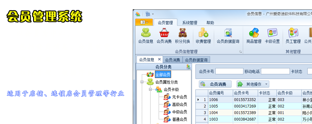 軟件以會員為中心,包括會員信息、會員收費、余額轉賬、會員消費、會員卡掛失/激活、會員換卡、密碼更新、會員延期、積分轉賬、積分兌換、商品管理、卡級設置,以及權限管理、數據字典管理等模塊內容,把科學的管理與信息技術結合起來,幫助企業規范會員管理的業務流程、提高會員管理的服務質量,達到全面提升企業核心競爭力的目的。